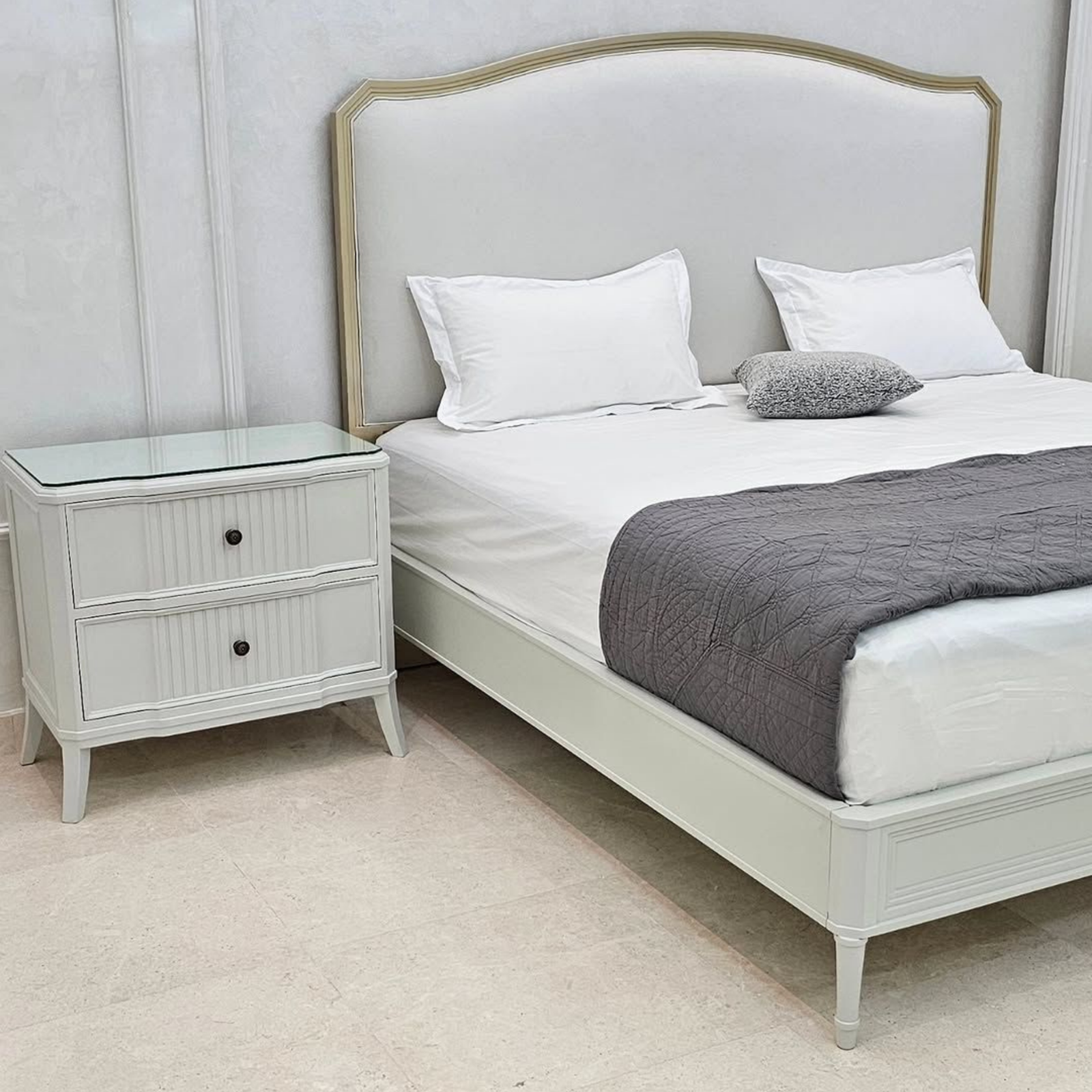 A sleek, modern bedroom featuring a cream‑colored upholstered bed with a plated headboard and matching frame, complemented by soft, layered bedding and minimalist décor.